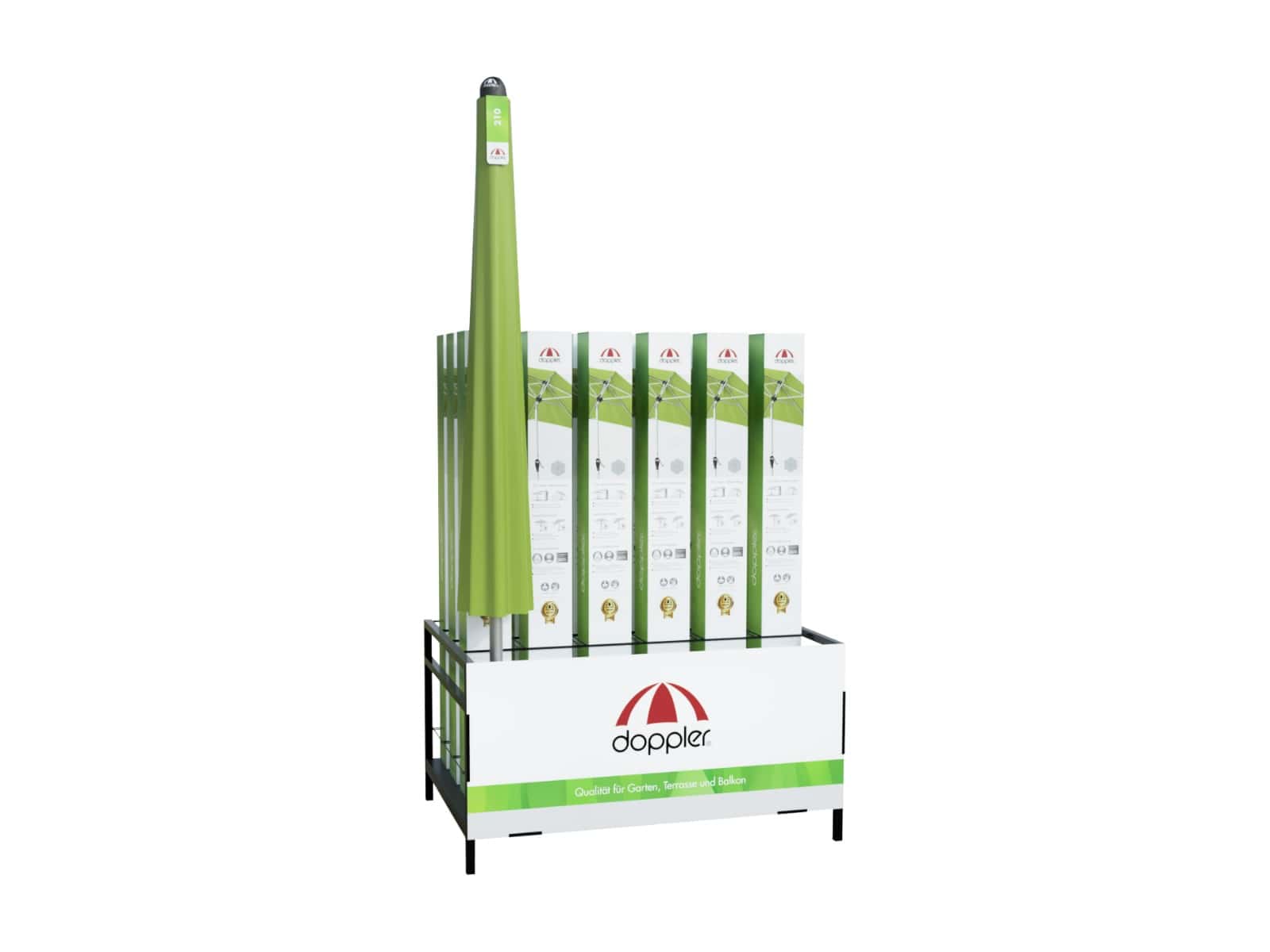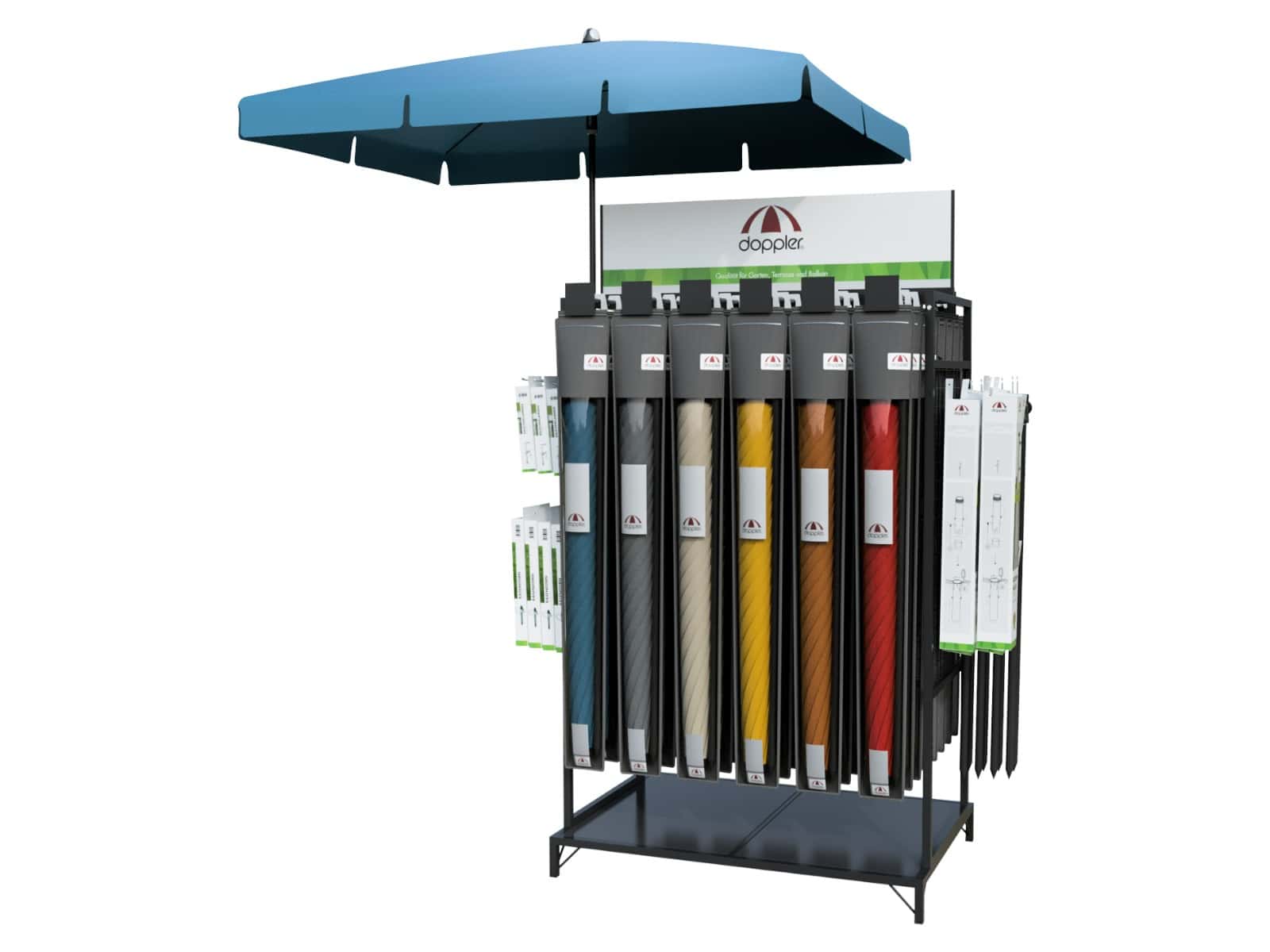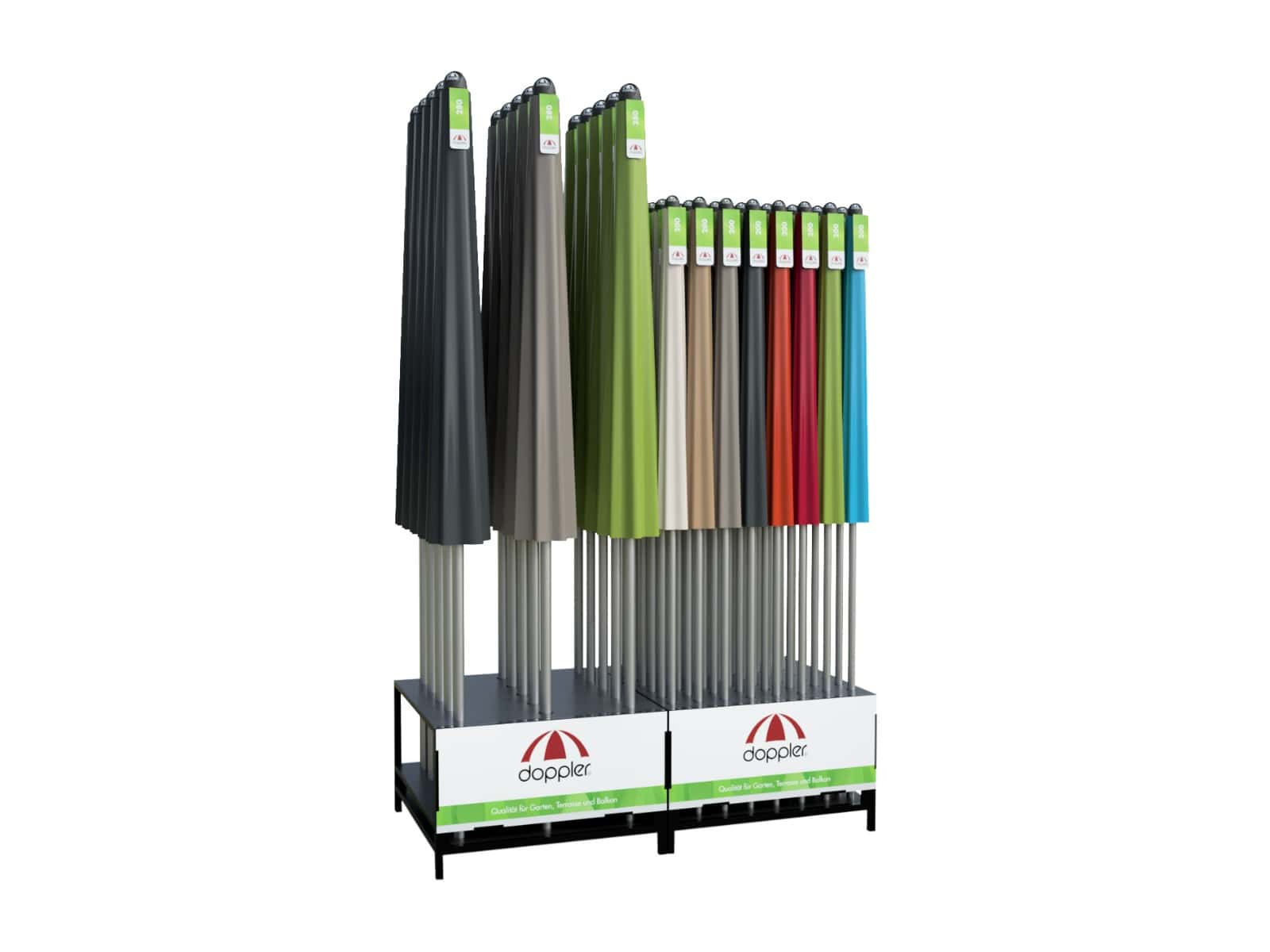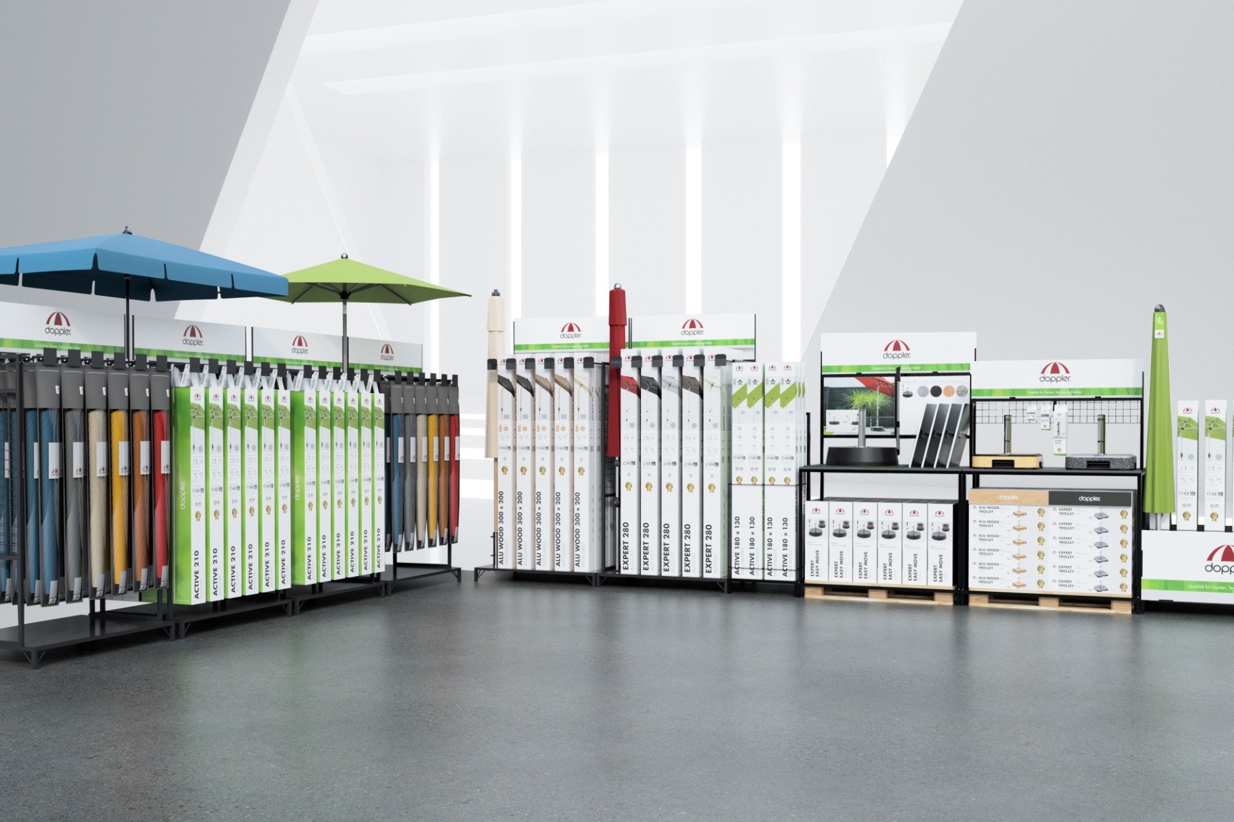 Hanging Rack, Grid Rack und das Mix-&-Match-Konzept sind nur einige der flexibel einsetzbaren Point-of-Sale-Systeme von doppler für den Fachhandel. Kompakte, aber vor allem interaktive Präsentationslösungen entwickeln sich zunehmend zu echten Verkaufsverstärkern am POS. Neben den flexiblen Warenträgern setzt doppler gezielt auf zusätzliche Informationsquellen: QR-Codes, Videos direkt am Produkt oder Karton, weiterführende Produktinfos und innovative AR-Anwendungen ermöglichen es dem Endkunden, den zukünftigen Sonnenschirm emotional und unmittelbar im Handel zu erleben.