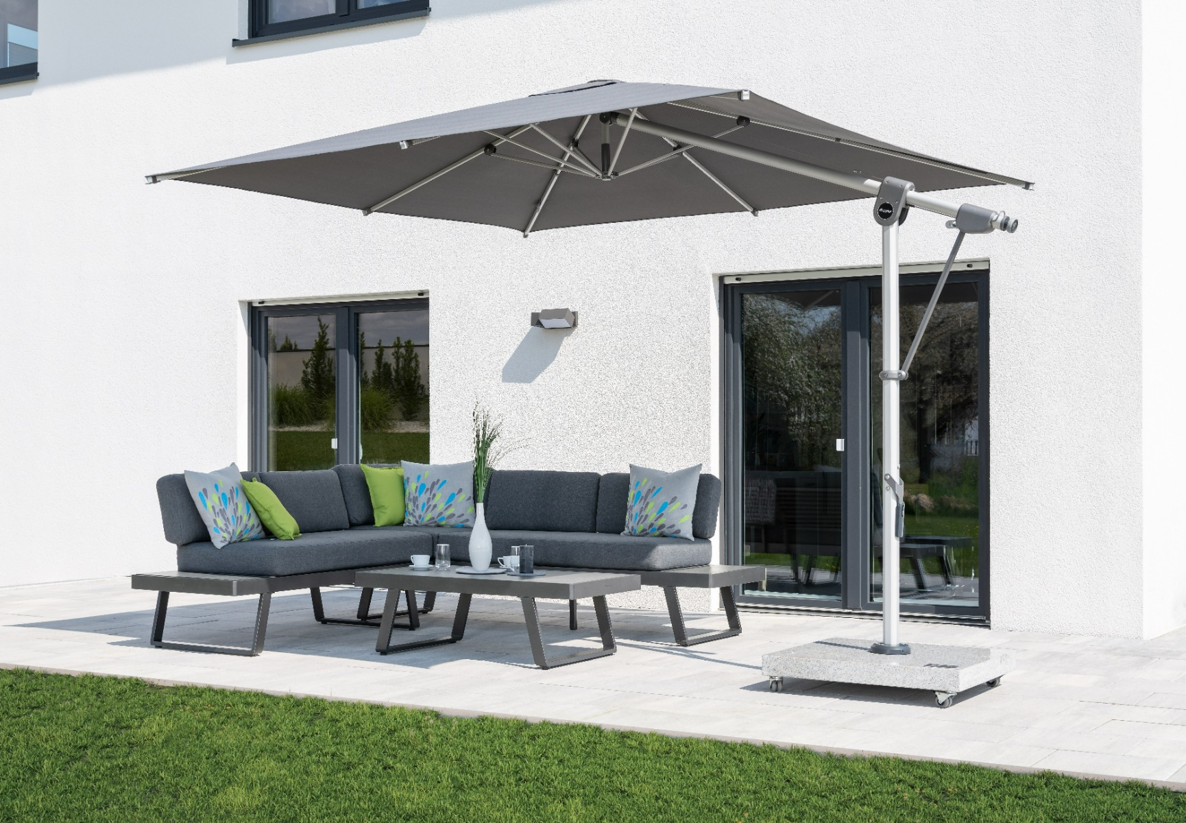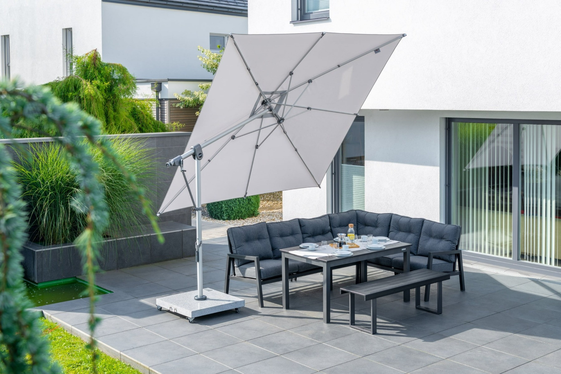 Ein Mast aus robustem Aluminium sowie eine fleckenschutzimprägnierte, wasserabweisende Bespannung sorgen dafür, dass der Sonnenschirm auch herbstliches Wetter mühelos übersteht. Abgerundet wird das Sortiment mit Granit- und Metallsockeln in besonders exklusivem Design. Die erweiterte Herstellergarantie von fünf Jahren auf alle Produkte von Knirps unterstreicht das Qualitätsversprechen.